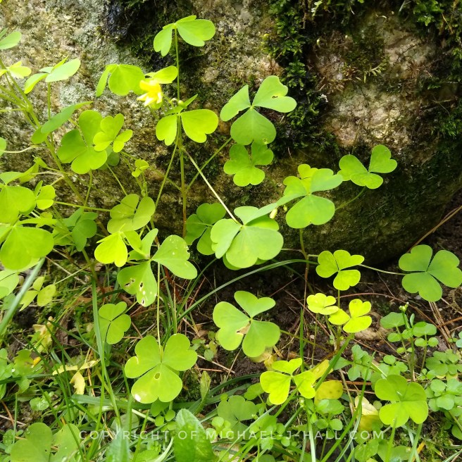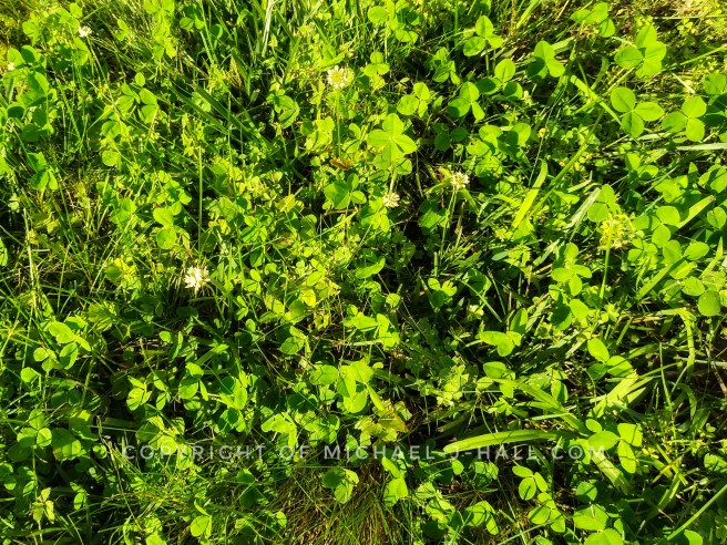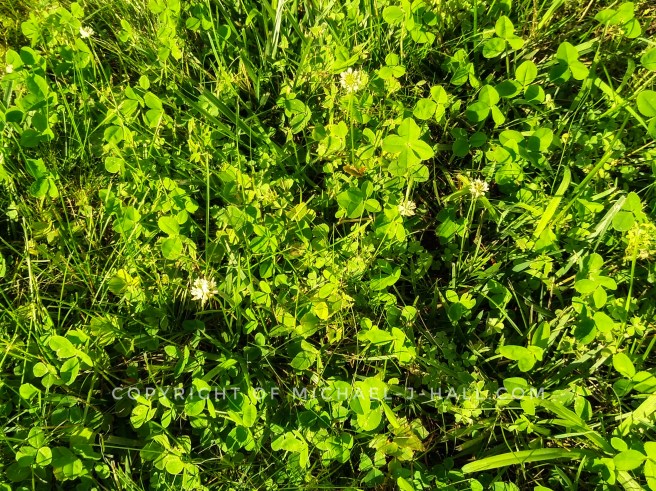 When it comes to looking for four leaf clovers, it’s best to have the sun on your back. The clover leaflets seek light and warmth, so if you stand in the path of their sunlight, they will appear spread out like windmills and solar panels before you. With the fronds all fanned out for you, the patterns are easier to spot.