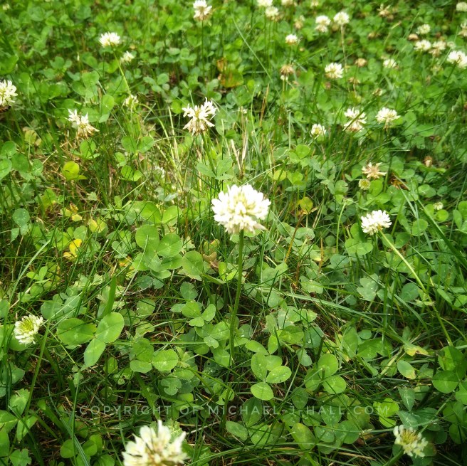 The four leaf variety is considered to be lucky, because “trifolium” translates literally as 3-leafed, which makes having more than 3 leaves highly uncommon and, therefore, special. There are different markings that can be found on the leaves of white clovers – some solid green, some with white or red variegation, but all will have the tell-tale whitish, globe shaped flower.