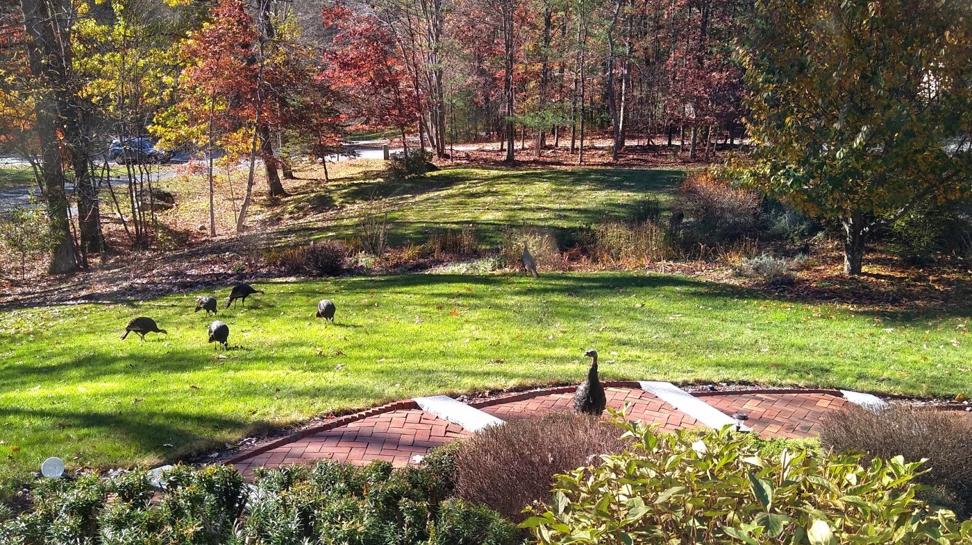 A rafter of turkeys floats through the yard having determined that it is fair game to pick at the remaining scraps of berries and morsels left among the vegetation, since no one else claimed them and they had once again forgotten to bring leftover containers.